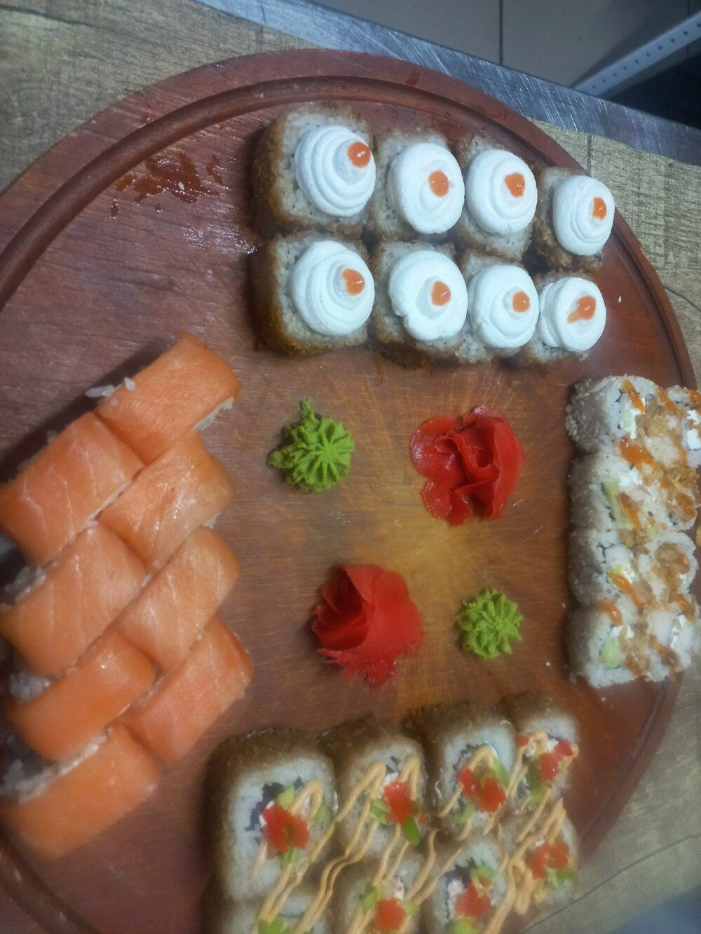 Филадельфия с айсбергом, холодный ролл Сенсей, жареный ролл Эби, жареный ролл Нагано. Соевый соус